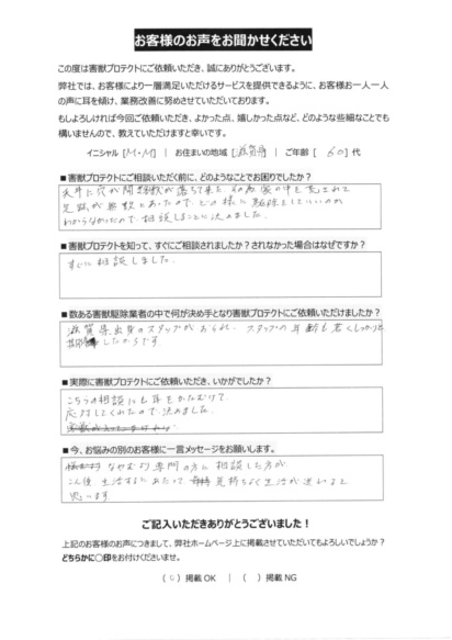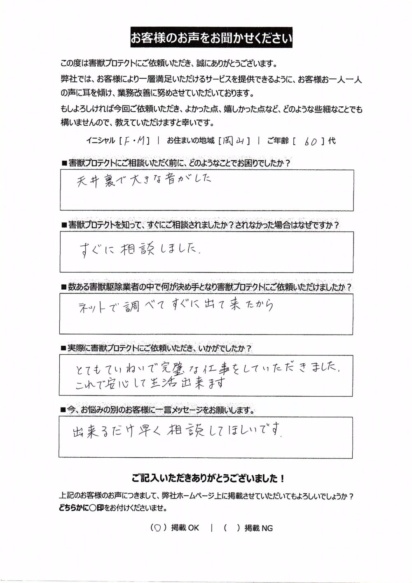 私たちは、ネズミやハクビシン、イタチなどによる被害や不安といったお悩みを、確かな技術と豊富な経験で解決します。単なる駆除だけでなく、再発防止や衛生管理まで徹底することで、お客様に「安心して暮らせる環境」と「毎日を気持ちよく過ごせる喜び」をお届けします。
